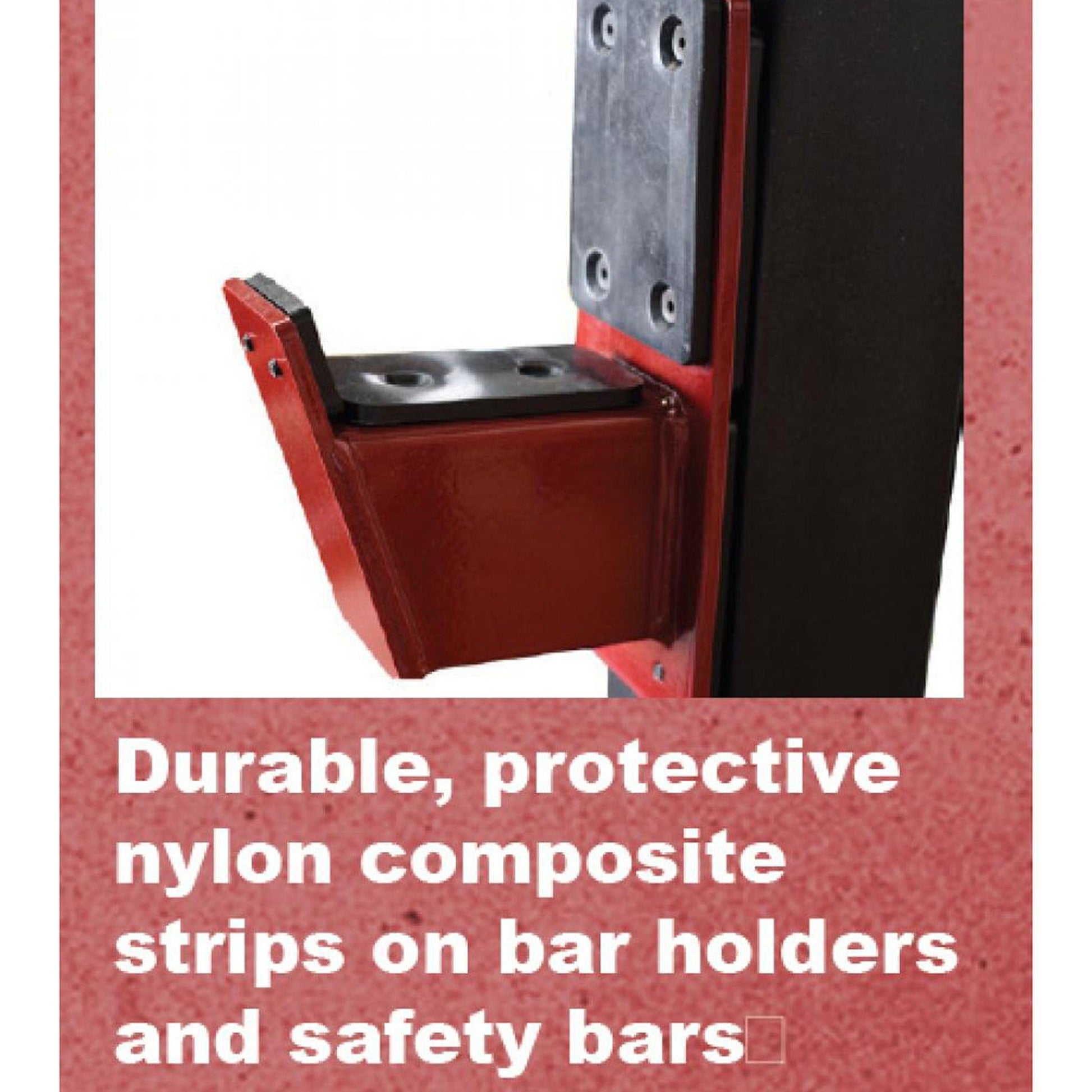 - EZ Adjustment of 1/4″ thick safety bars and Olympic bar holders