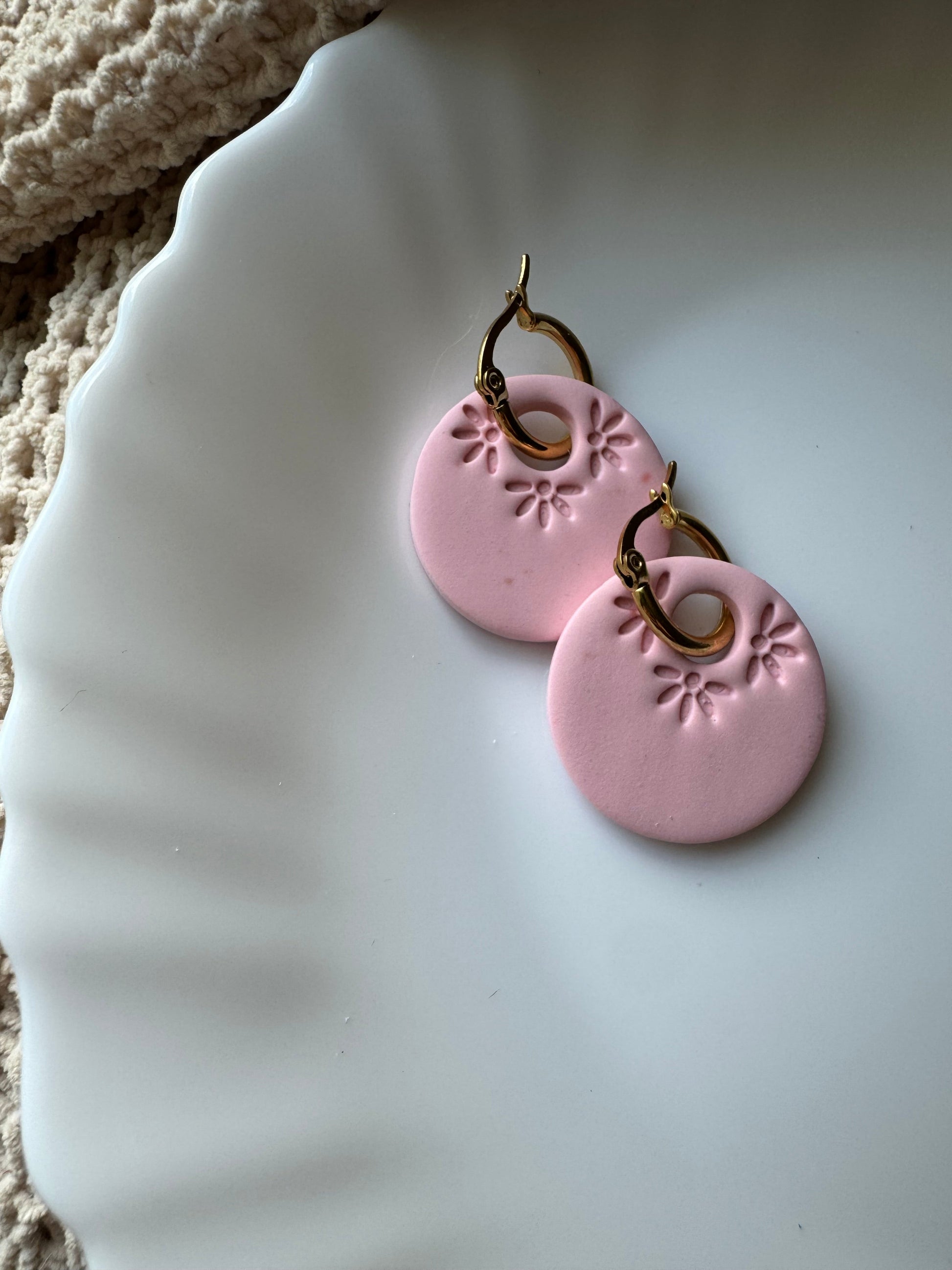 Earrings are made of polymer clay and hardware is 14k gold plated - nickel free. Each piece is rolled, cut, baked, sanded and assembled by hand, so sizes and custom-mixed colors will vary per piece. Due to the handmade nature of my pieces, slight imperfections are inevitable. Every piece is truly one of a kind.