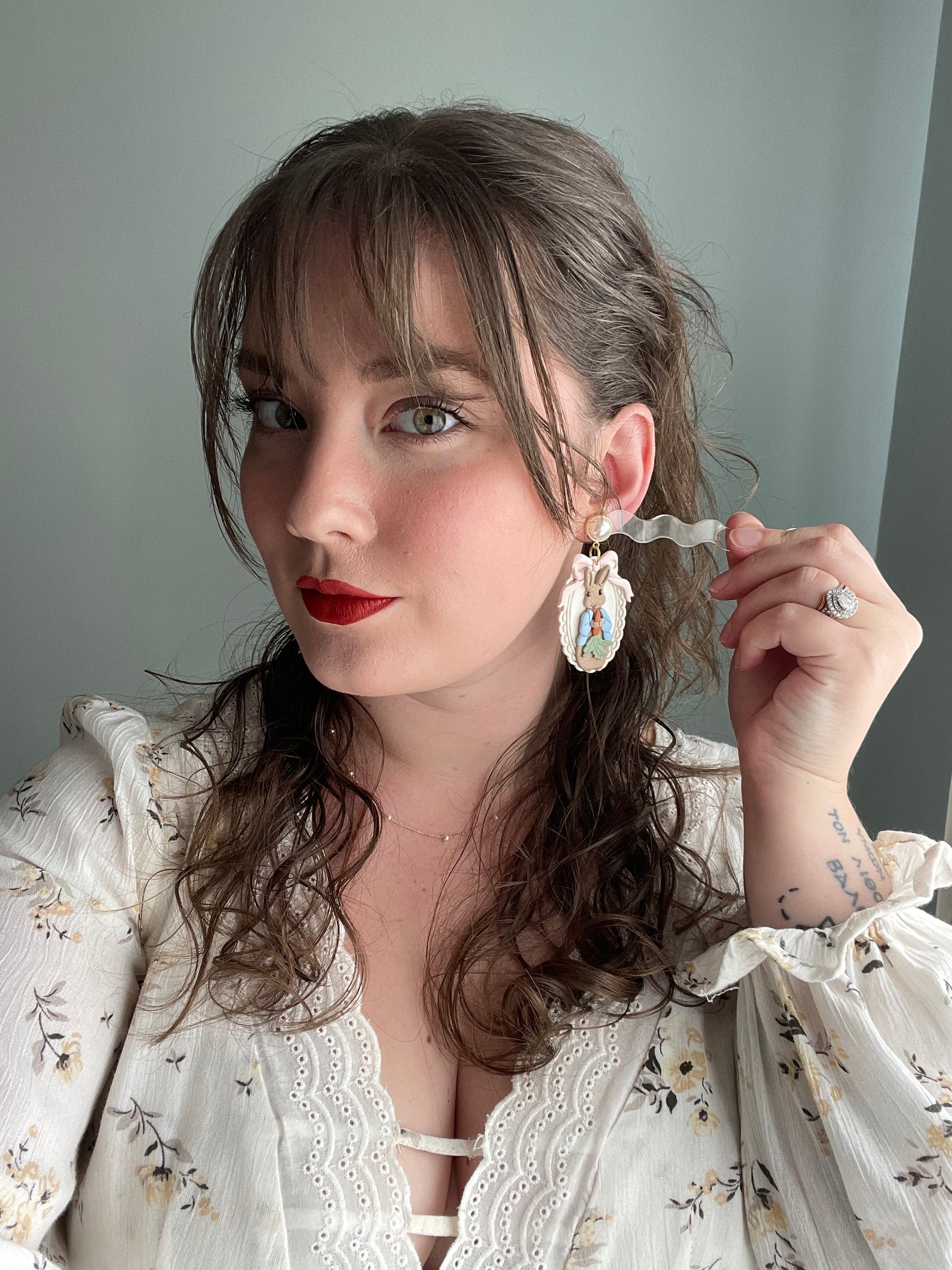Earrings are made of polymer clay and hardware is 14k gold plated - nickel free. Each piece is rolled, cut, baked, sanded and assembled by hand, so sizes and custom-mixed colors will vary per piece. Due to the handmade nature of my pieces, slight imperfections are inevitable. Every piece is truly one of a kind.
