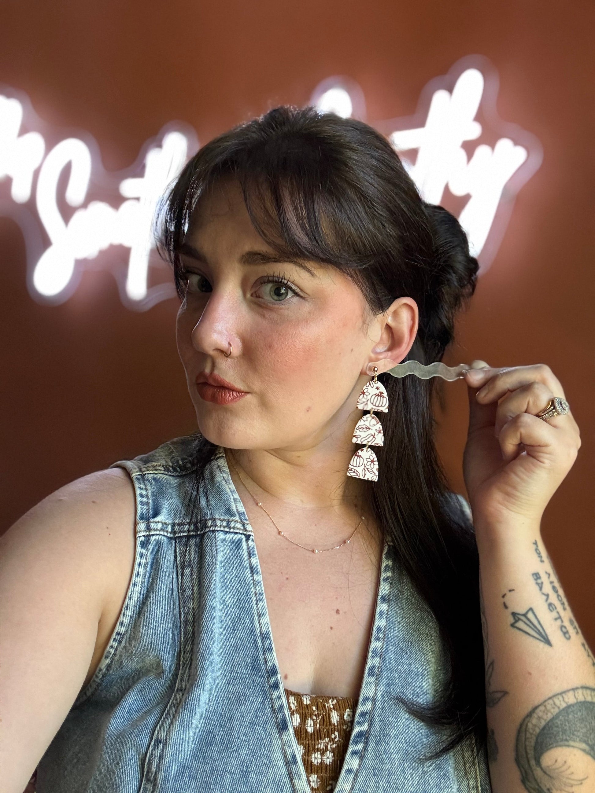 Earrings are made of polymer clay and hardware is 14k gold plated - nickel free. Each piece is rolled, cut, baked, sanded and assembled by hand, so sizes and custom-mixed colors will vary per piece. Due to the handmade nature of my pieces, slight imperfections are inevitable. Every piece is truly one of a kind.